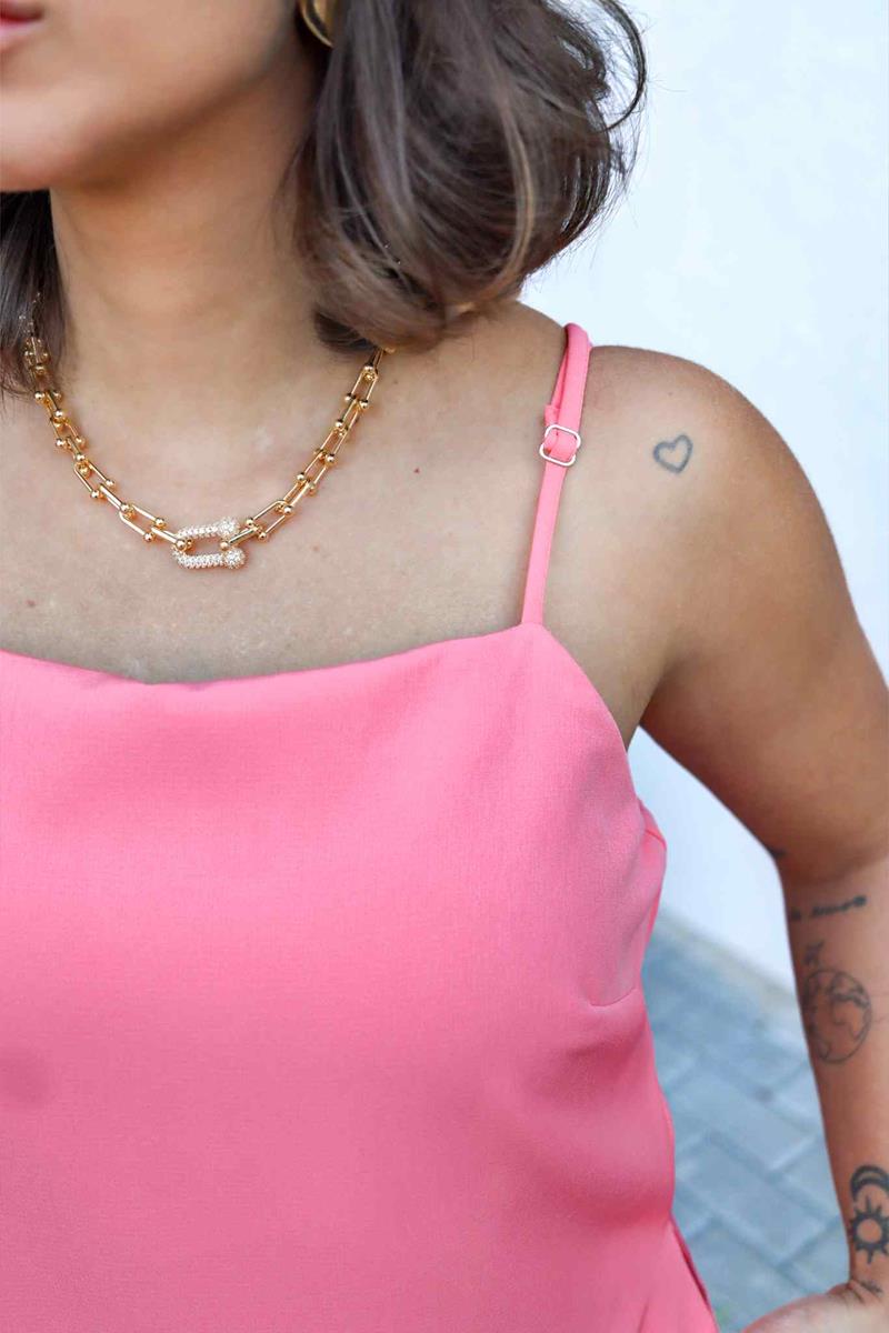 “Delicado e vibrante, o macaquinho curto coral é a escolha perfeita para dias de sol e momentos leves. Com modelagem fluida e alcinhas ajustáveis, ele une conforto e feminilidade em uma peça só. Ideal para produções casuais com charme e frescor.”