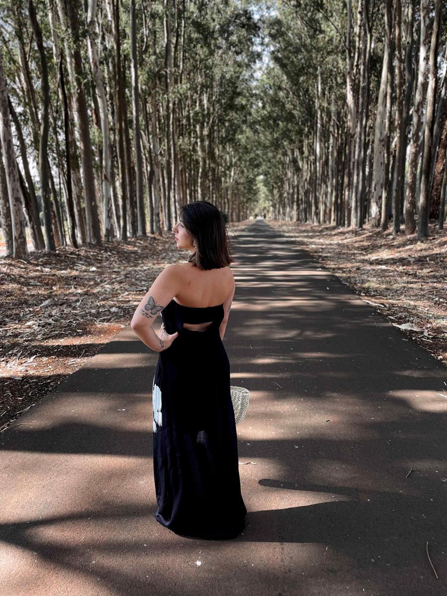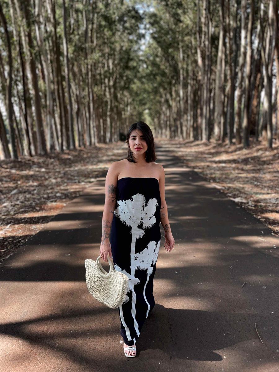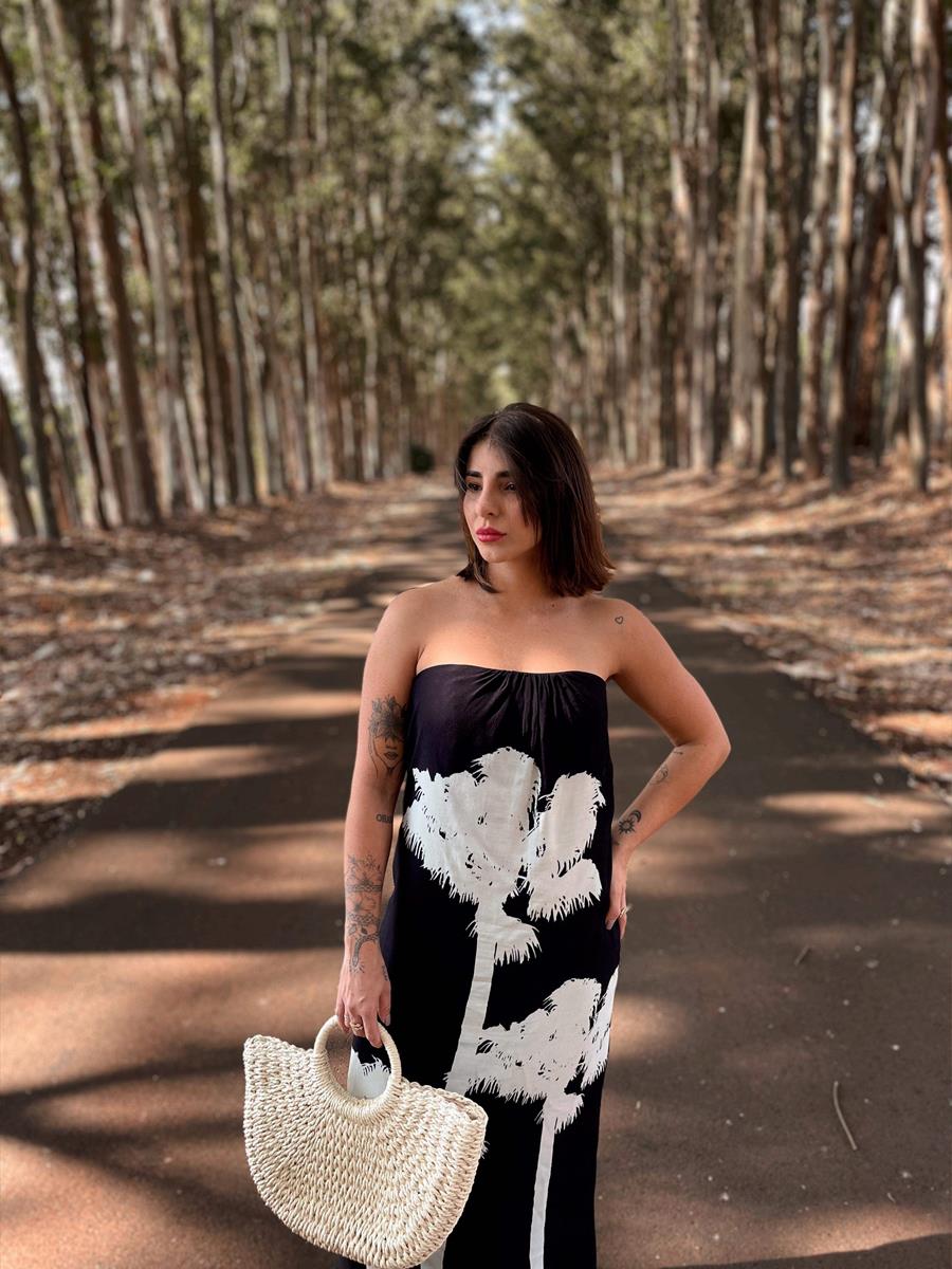 A personificação da sofisticação tropical, o Vestido Column Dress OPEN é uma peça que celebra a força e a beleza da natureza. Sua silhueta alongada e elegante, combinada à estampa maxi de coqueiros, cria um visual impactante e cheio de personalidade. É um convite para se reconectar com sua essência, envolvendo o corpo em um design que é, ao mesmo tempo, livre e poderoso, finalizado com um surpreendente decote nas costas que revela a pele com elegância.