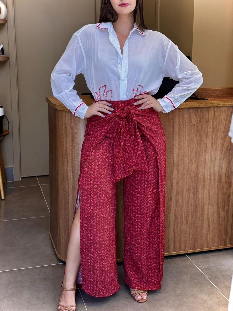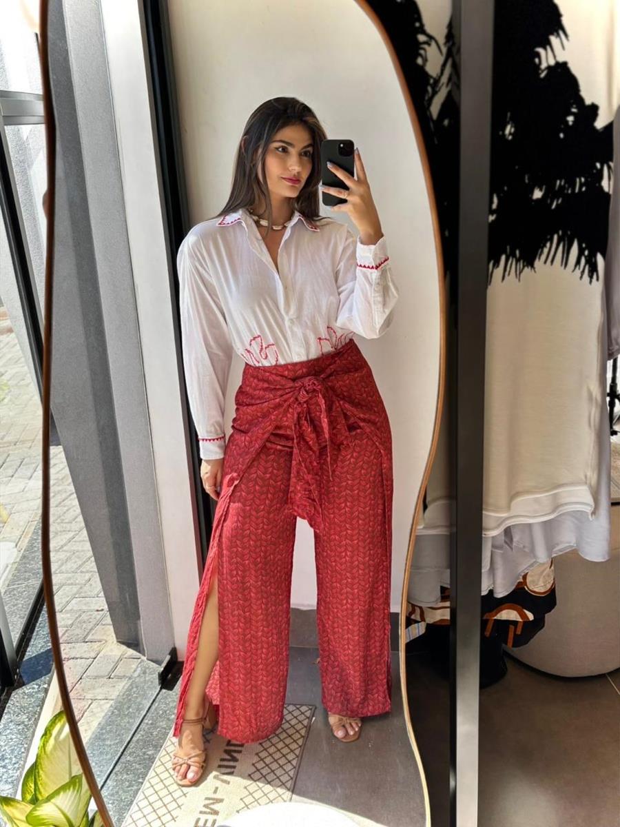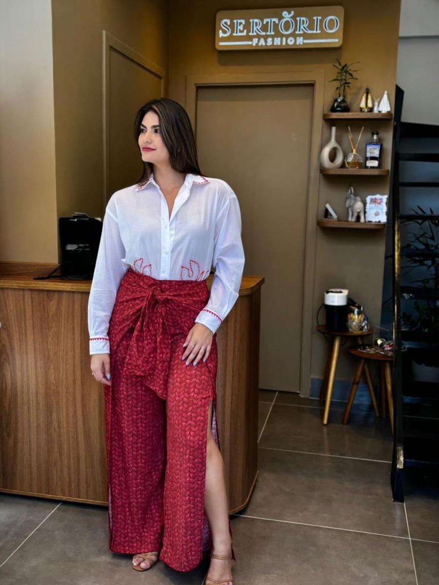 Calça feminina pantalona confeccionada em 100% viscose, oferecendo leveza e caimento fluido. Possui modelagem ampla com fendas laterais que proporcionam movimento e estilo, além da estampa exclusiva que garante um visual moderno e sofisticado. Perfeita para compor looks versáteis, do dia a dia a ocasiões especiais.