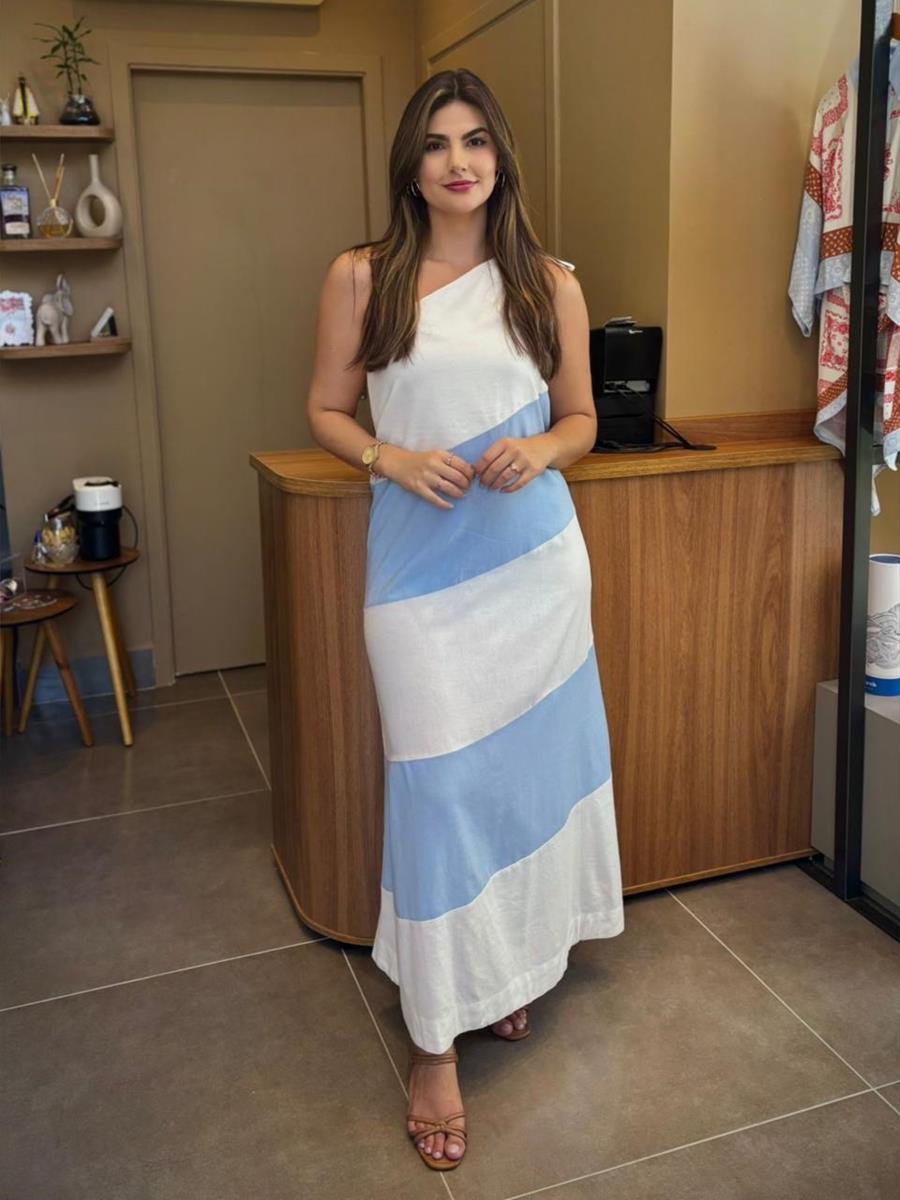 Vestido confeccionado em tecido misto de 55% viscose e 45% linho. Possui modelagem sofisticada com design de um ombro só e recortes estratégicos que valorizam a silhueta. A combinação dos tecidos garante leveza, caimento natural e conforto, tornando a peça ideal para produções elegantes e modernas.