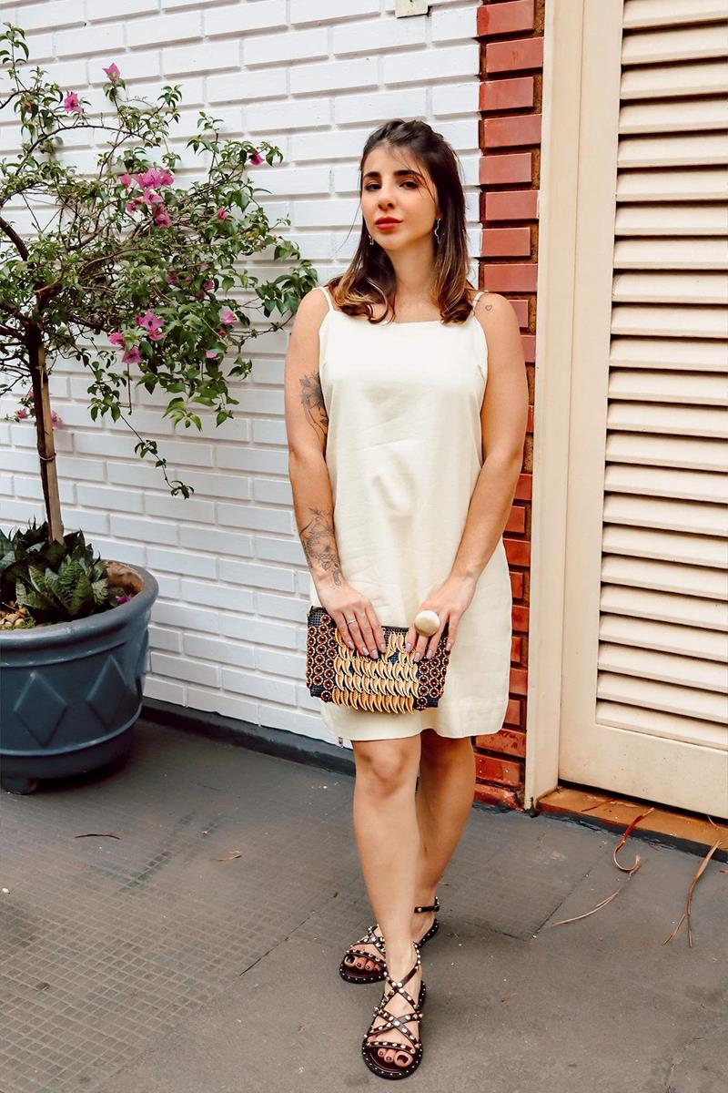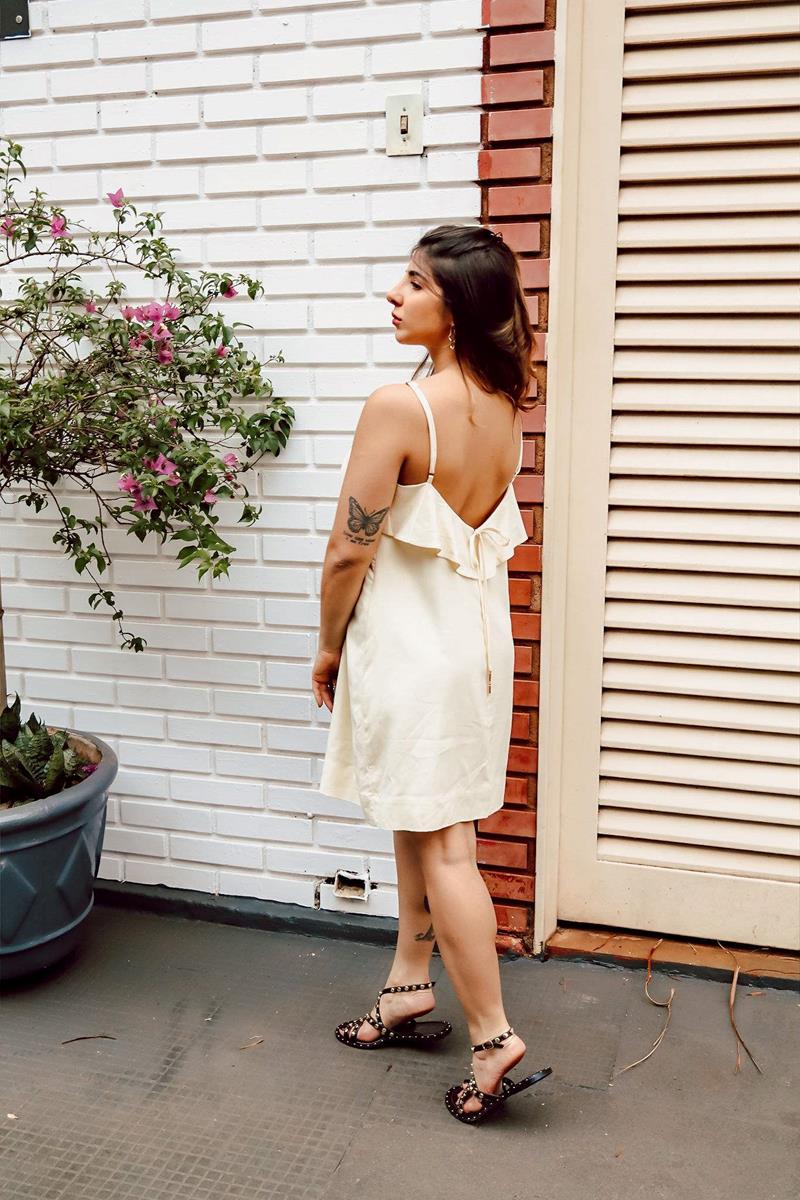 Vestido curto em linho com babados delicados, caimento leve e toque natural. Um clássico feminino para produções frescas e elegantes.