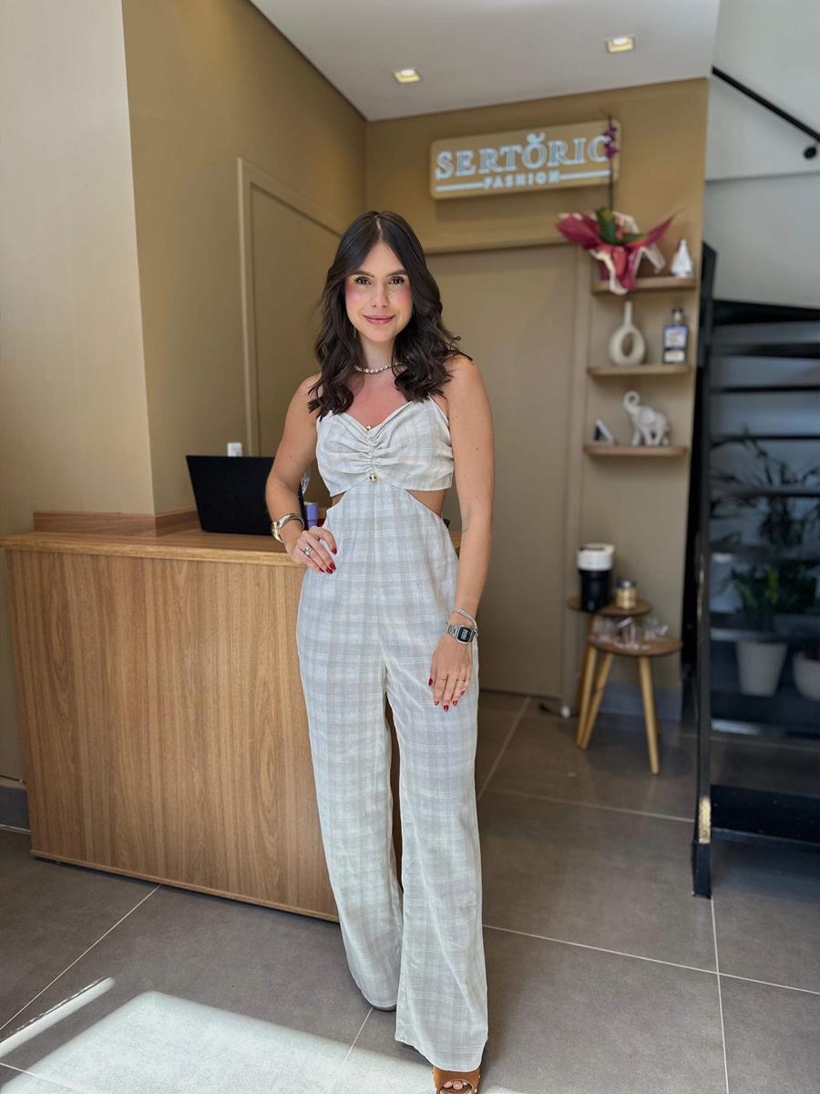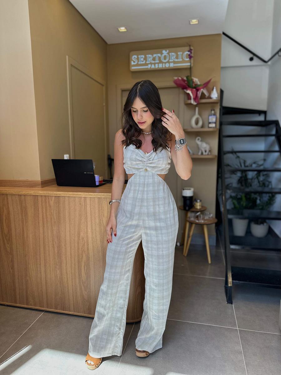 O macacão pantalona em linho xadrez é a escolha ideal para quem busca sofisticação e praticidade. Confeccionado em tecido misto que une poliéster, linho, algodão e viscose, ele oferece leveza, conforto e caimento impecável. A estampa clássica em xadrez adiciona charme atemporal, enquanto a modelagem pantalona alonga a silhueta com elegância.