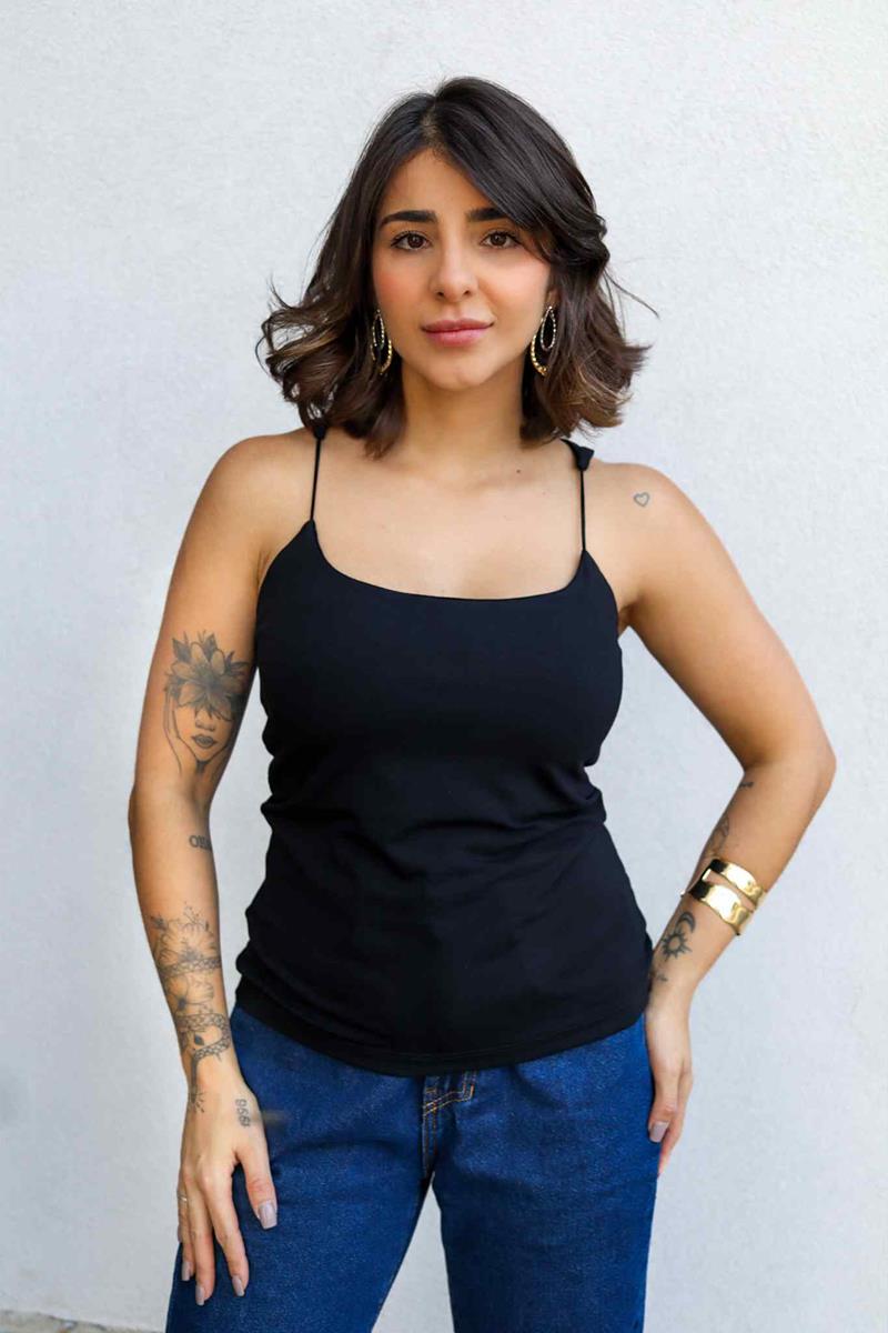 Clássica e atemporal, essa blusa é aquela peça-chave que combina com tudo. Confeccionada em tecido leve e confortável, possui modelagem ajustada e alças finas que valorizam o colo com delicadeza.